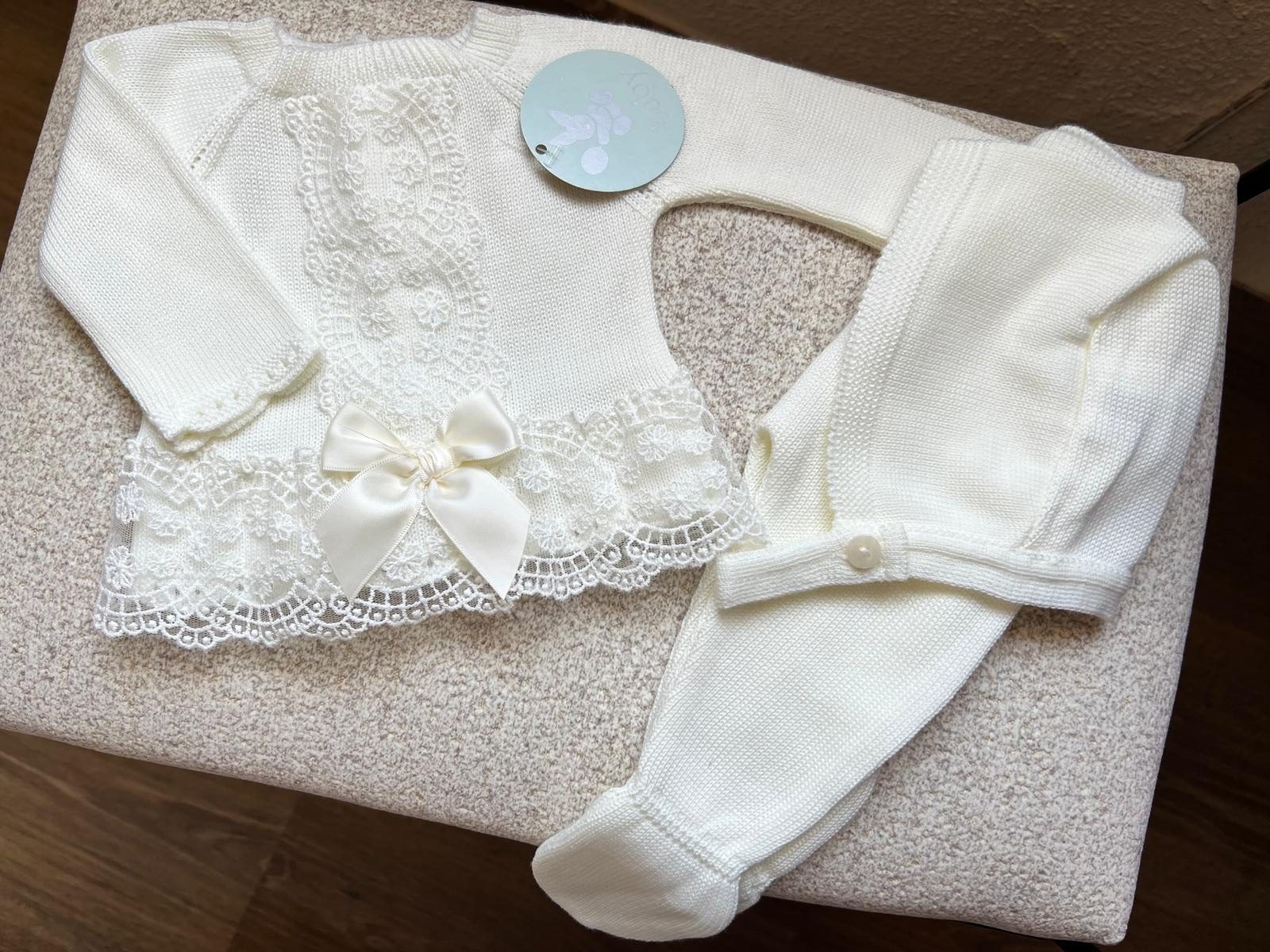 Conjunto unisex para bebé en hilo color marfil con encaje. Tres piezas: jersey, polaina y capota.